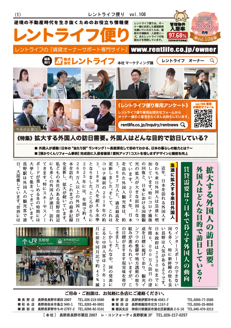 私たちレントライフの取り組みや今の賃貸市場動向など、家主様の賃貸経営に役立つ情報をお届けする賃貸経営者必読の情報誌です。